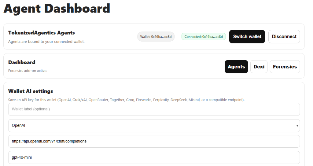 Tokenized Agentics lets paid members create wallet-bound AI agents inside your account. Connect your wallet, spin up one or more named agents, and chat with them in a private dashboard. Agents stay tied to the wallet you choose, so switching wallets cleanly switches which agents you see and use.